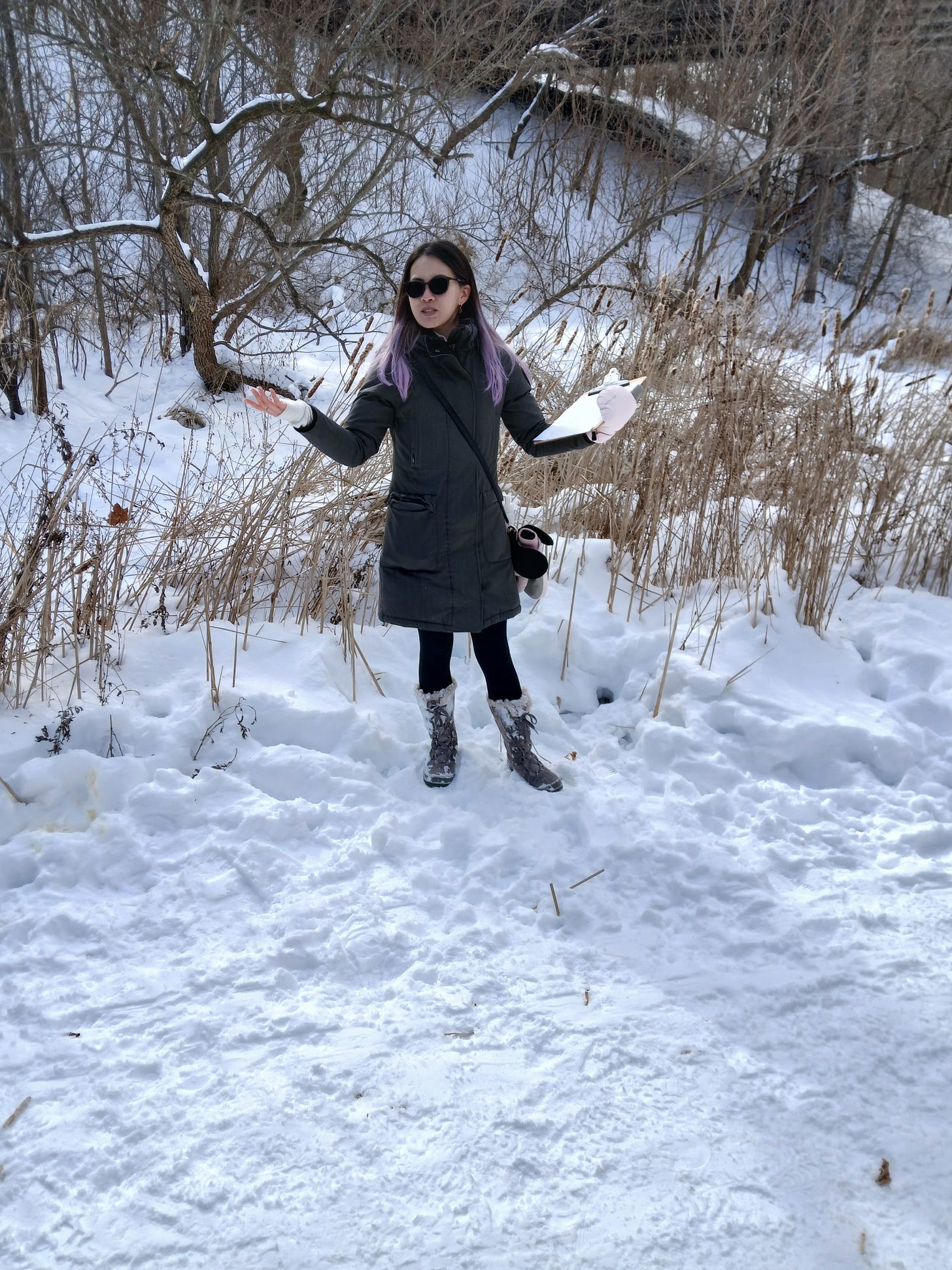 We moved on to the cattail wetland starting at the Bathurst St bridge. This is one of the gems of the ravine. Lan told us that, once the subway was built under the ravine, water started to pool on top of it, providing suitable conditions for a wetland. The cattails (Typha) seeded themselves; there are native, non-native and hybrid species present. The wetland continues to spread in both directions in the ravine. In my post of 30th October 2024, I noted that a New York Times reporter had claimed to have seen a leopard frog in the wetland.