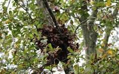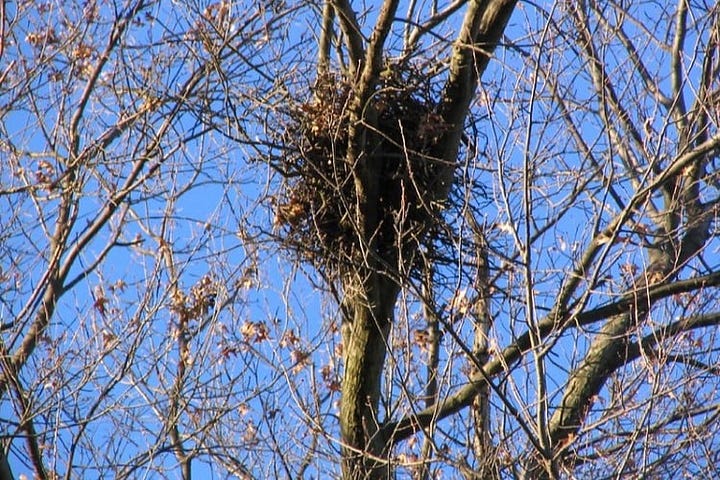 At this point, Mark also pointed out some squirrel dreys and talked about them. The Eastern grey squirrel builds these nests for itself in trees that provide food e.g. oaks, which provide acorns. They use twigs for the outside and line the inside with dry leaves, grass, moss and shredded bark. Mark said squirrels make several dreys and move among them; some 6-8 squirrels share a drey. In the winter, several squirrels will stay in one drey together for warmth. They enter the drey through a hole facing the tree trunk and may also have a second escape hole.