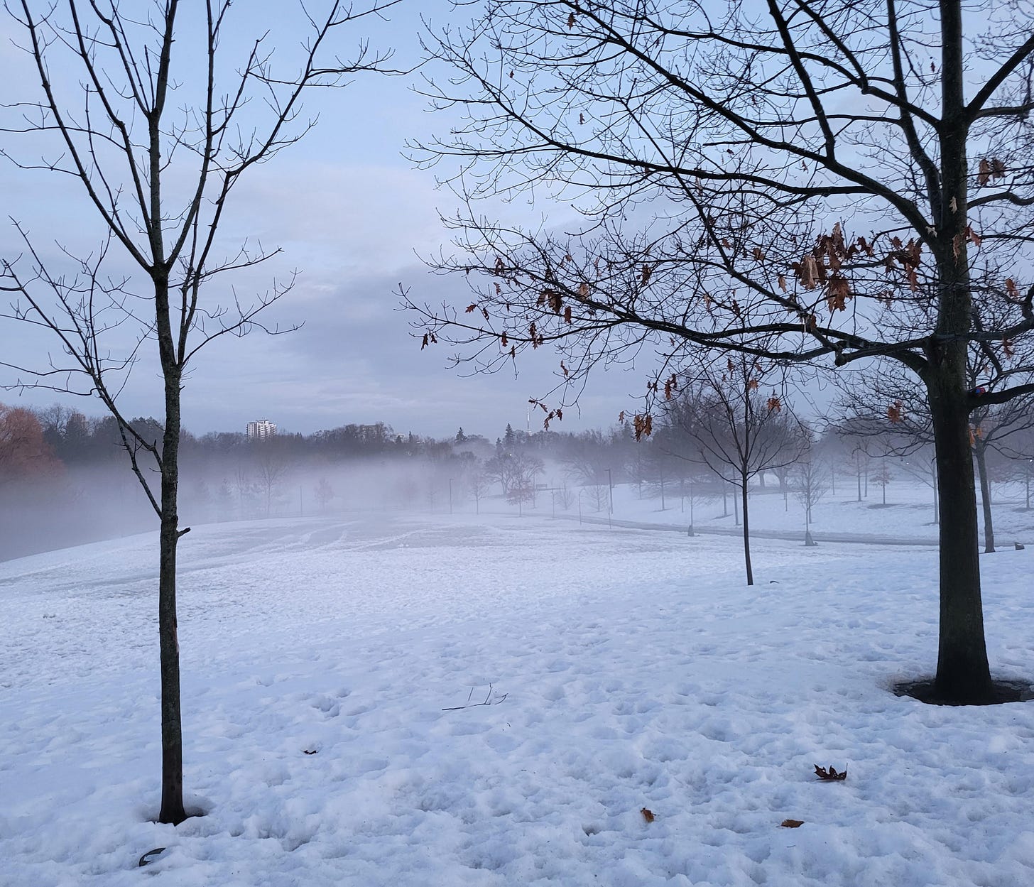 This is the view across the playing field to the dog park. I think the top of the apartment building on the horizon is on Raglan Ave: